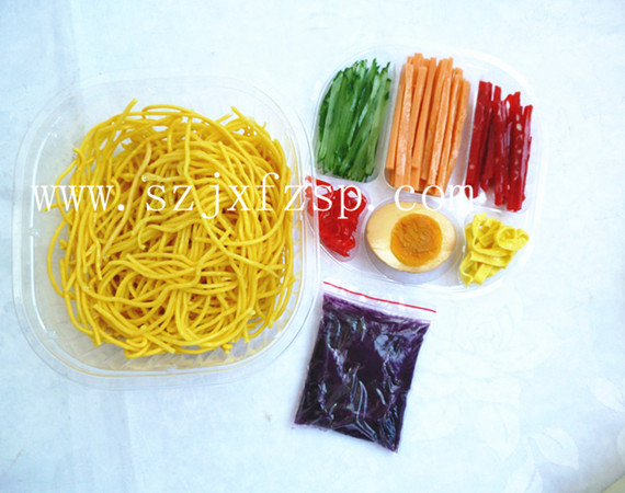 仿真菜:韓式拌面仿真菜.深圳久新專業生產銷售仿真菜,韓式拌面仿真菜--材料:冷面熟雞蛋黃瓜絲牛肉片腌蘿卜條梨片一點紅辣椒絲.拌面料:辣椒醬(最好是韓國的太陽草辣醬)辣椒面(細的)切片后剩的梨磨成茸,以澤豐富多彩,讓人看上一眼就胃口大開,大大的從感觀上刺激了消費者的欲望!