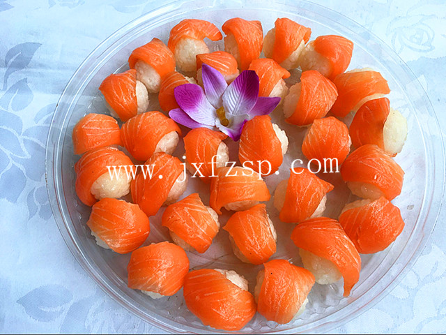 仿真食品 :三文魚球壽司仿真食品,艷而不俗的三文魚球仿真壽司模型,給你一種耳木一新的刺激感,大大的從感觀了強烈的刺激感,讓你有一種欲罷不能的新體驗!