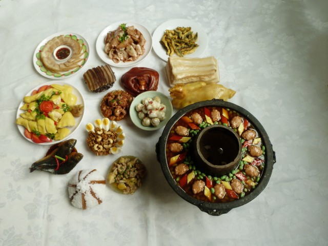 在南方都會是一盆海鮮盆菜模型,作為年夜飯的主打特色,一方一俗,各自為主題,把當地的過年氣氛完全的展示出來,