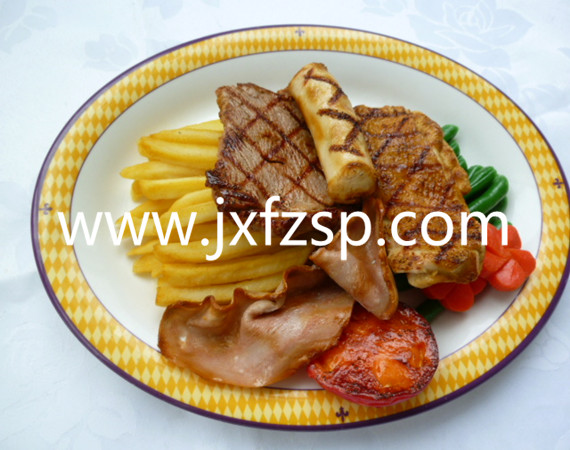 仿真燒烤食品模型:皇家混合燒烤模型。逼真的造型,烤牛肉模型清晰的紋理鮮嫩欲滴,配上嫩綠的豆角模型,焦黃的署條和西紅柿,正是上等人有以前的皇帝貴族才可以享有的最高待遇,現在也促漸走進平常百姓人家中,看到這一份如些高檔精美的皇家混混合燒烤模型,你是不是也心動了,只可惜,這只是一份食品模型,秀色不可餐喲。