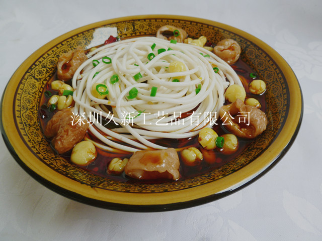 仿真菜: 婉豆肥腸面仿真菜。絲絲入扣的形態形象逼真的造型,把一份假菜模型淋漓盡致的展出了這份食品的靈魂所在,大大的刺激了消費欲望