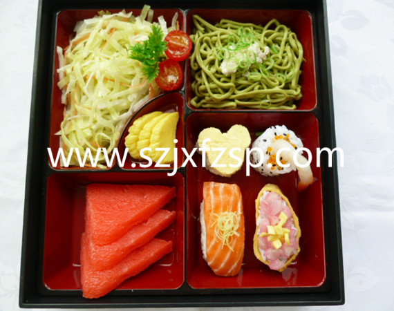 日本料理模型:日式三文魚壽司便當模型。高檔的日料理,食材豐富,色澤亮麗耶菜絲線入扣,色香味都大大的俘獲人心,不管老少皆大歡喜,特別的鮮紅的西紅市格外的醒目